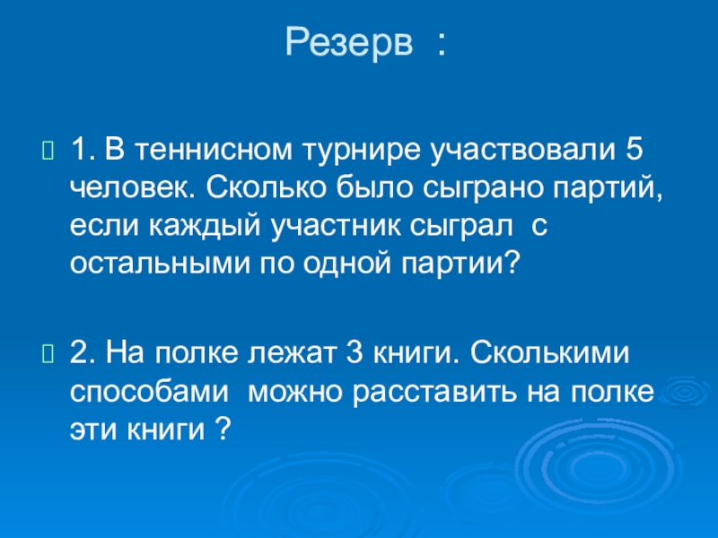 Резерв : 1. В теннисном турнире участвовали 5 человек. Сколько было сыграно партий, если каждый участник сыграл