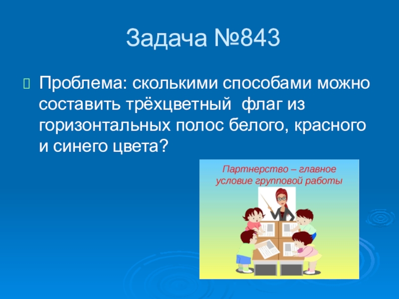 Задача №843Проблема: сколькими способами можно составить трёхцветный флаг из горизонтальных полос белого, красного и синего цвета?