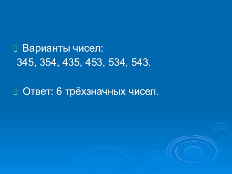 Варианты чисел: 345, 354, 435, 453, 534, 543.Ответ: 6 трёхзначных чисел.