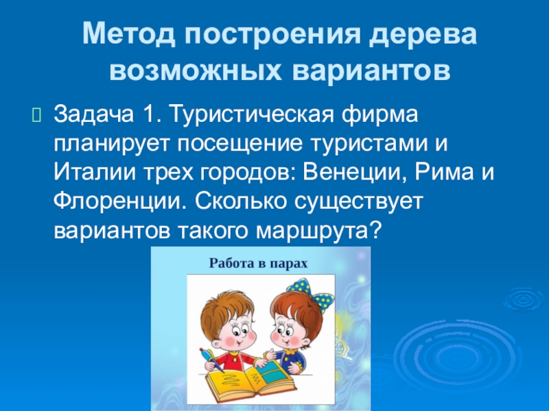 Метод построения дерева возможных вариантов Задача 1. Туристическая фирма планирует посещение туристами и Италии трех городов: Венеции,