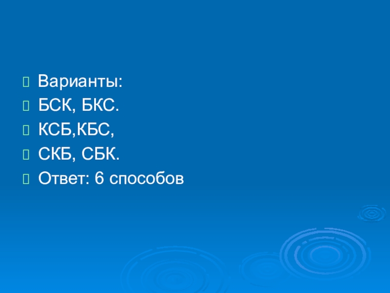 Варианты: БСК, БКС. КСБ,КБС, СКБ, СБК.Ответ: 6 способов