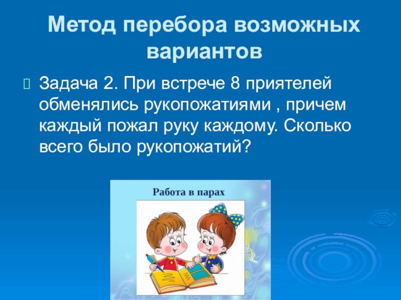 Метод перебора возможных вариантов Задача 2. При встрече 8 приятелей обменялись рукопожатиями , причем каждый пожал руку