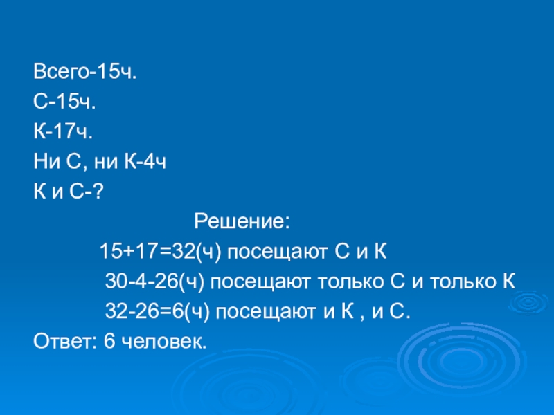 Всего-15ч.С-15ч.К-17ч.Ни С, ни К-4чК и С-?