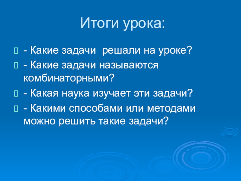Итоги урока:- Какие задачи решали на уроке?- Какие задачи называются комбинаторными?- Какая наука изучает эти задачи?- Какими