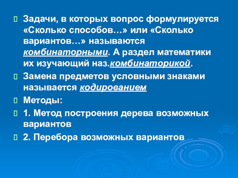 Слайд 4Задачи, в которых вопрос формулируется «Сколько способов…» или «Сколько вариантов…» называются
