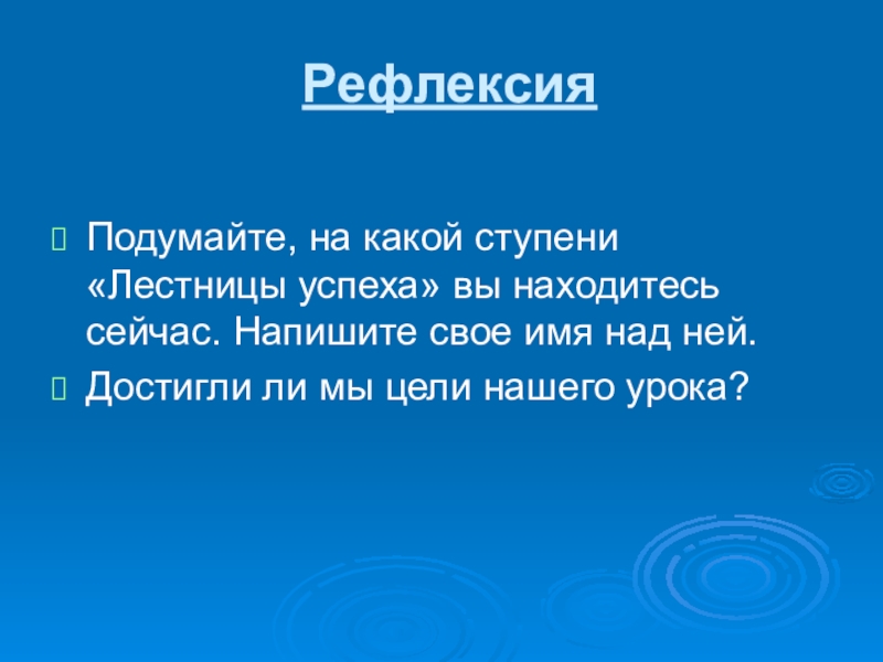 Рефлексия Подумайте, на какой ступени «Лестницы успеха» вы находитесь сейчас. Напишите свое имя над ней.Достигли ли мы