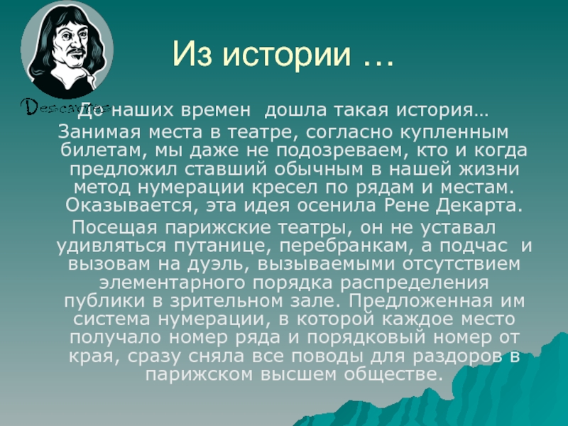 В 1637 году Рене Декарт в книге «Геометрия « дал описание применения координат, поэтому прямоугольную систему координат часто называют декартовой.