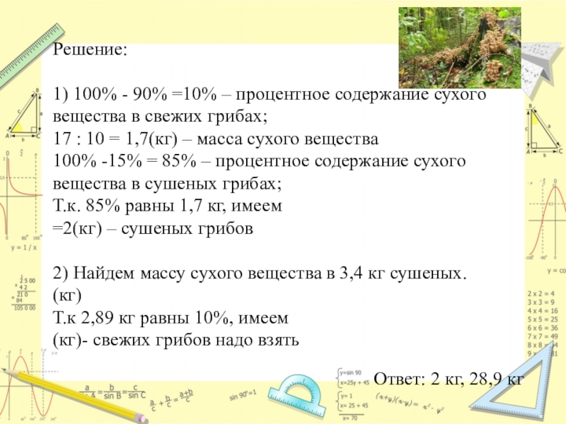 2. Свежий гриб содержит 90% воды, а сушеный 15%. Сколько сушеных грибов получится из 17 кг свежих? Сколько надо взять свежих грибов, чтобы получить 3,4 кг сушеных?