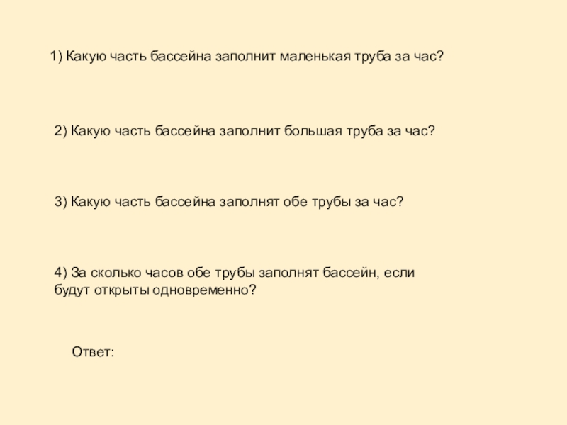 4) За сколько часов обе трубы заполнят бассейн, если будут открыты одновременно?