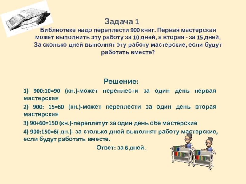 1) 900:10=90 (кн.)-может переплести за один день первая мастерская