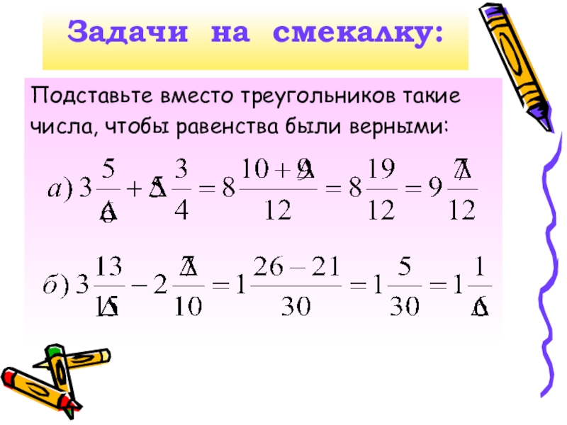 Задачи на смекалку:Подставьте вместо треугольников такиечисла, чтобы равенства были верными: