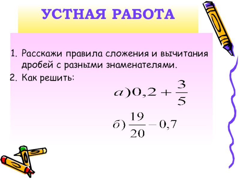 УСТНАЯ РАБОТАРасскажи правила сложения и вычитания дробей с разными знаменателями. Как решить: