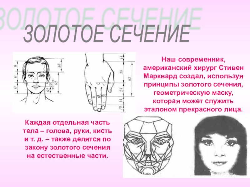 Наш современник, американский хирург Стивен Марквард создал, используя принципы золотого сечения, геометрическую маску, которая может служить эталоном прекрасного лица.