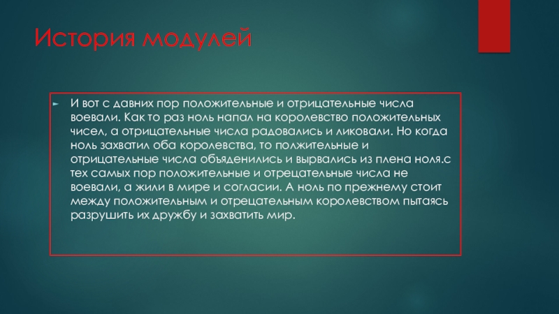 История модулейИ вот с давних пор положительные и отрицательные числа воевали. Как то раз ноль напал на королевство положительных чисел, а отрицательные числа радовались и ликовали. Но когда ноль захватил оба королевства, то полжительные и отрицательные