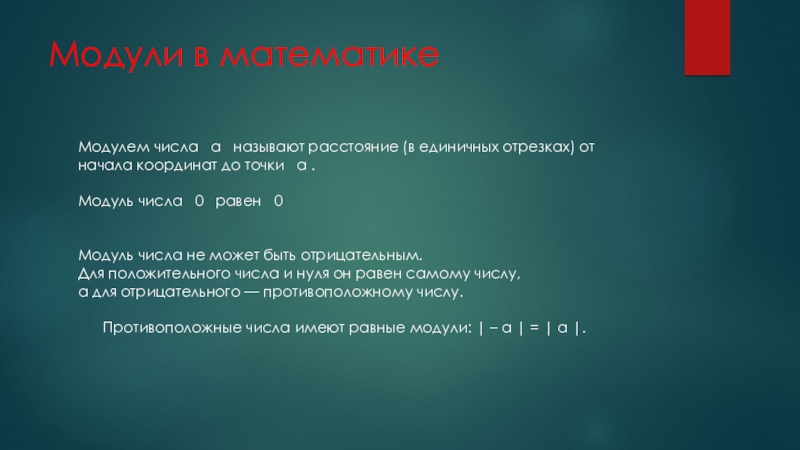 Модули в математике Модулем числа   a   называют расстояние (в единичных отрезках) от начала координат до