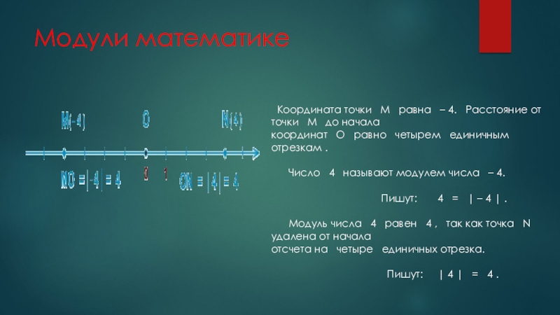 Расстояние от точки   М   до начала  координат   О   равно   четырем   единичным отрезкам .        Число   4   называют модулем числа   – 4.                                        Пишут:       4   =   | – 4 | .        Модуль числа   4   равен   4 ,   так как точка   N   удалена от начала  отсчета на   четыре   единичных отрезка.                                          Пишут:     | 4 |   =   4 .