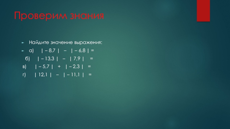 Проверим знанияНайдите значение выражения: а)   | – 8,7 |  –  | – 6,8