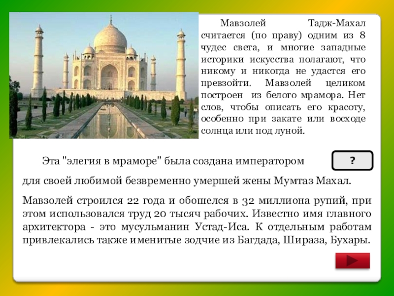 Мавзолей Тадж-Махал считается (по праву) одним из 8 чудес света, и многие западные историки искусства полагают, что никому и никогда не удастся его превзойти. Мавзолей целиком построен из белого мрамора. Нет слов, чтобы описать его красоту, особенно при закате или восходе солнца или под луной.