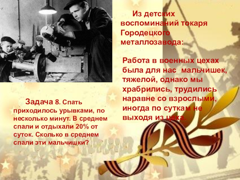 Задача 8. Спать приходилось урывками, по несколько минут. В среднем спали и отдыхали 20% от суток. Сколько в среднем спали эти мальчишки?