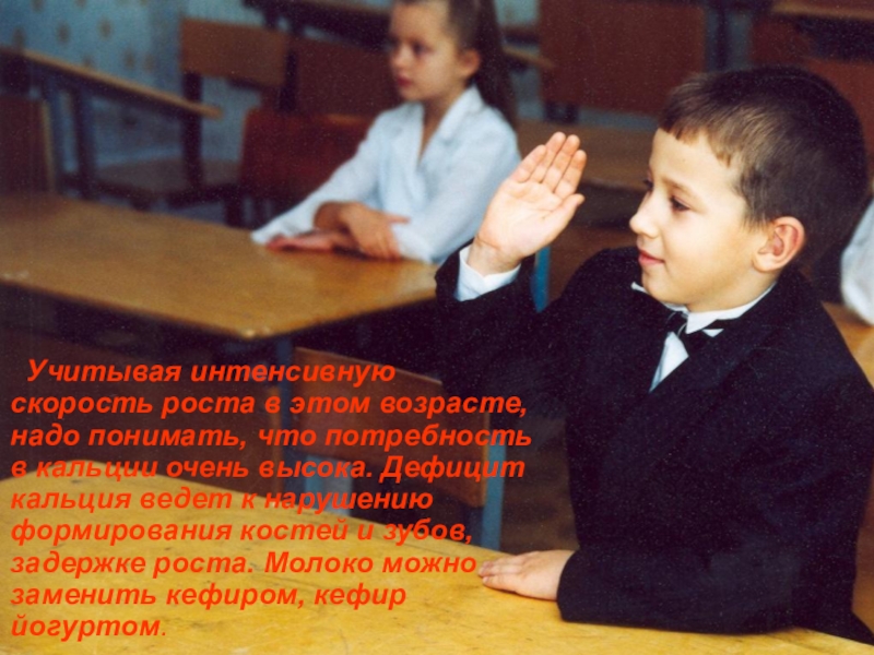 понимать, что потребность в кальции очень высока. Дефицит кальция ведет к нарушению формирования костей и зубов, задержке роста. Молоко можно заменить кефиром, кефир йогуртом.