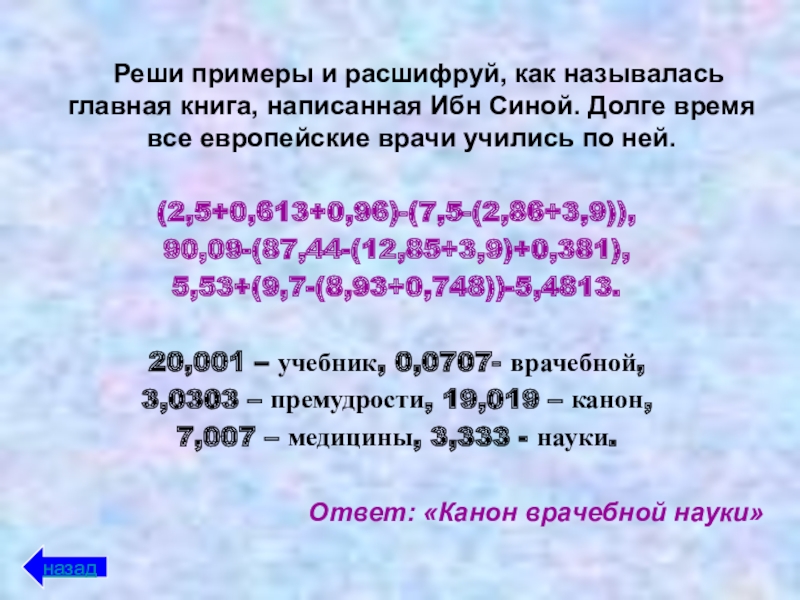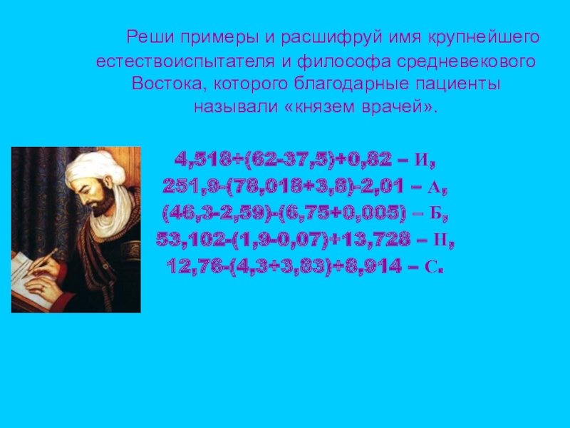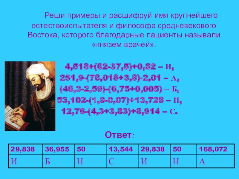 Слайд 13 Реши примеры и расшифруй имя крупнейшего естествоиспытателя