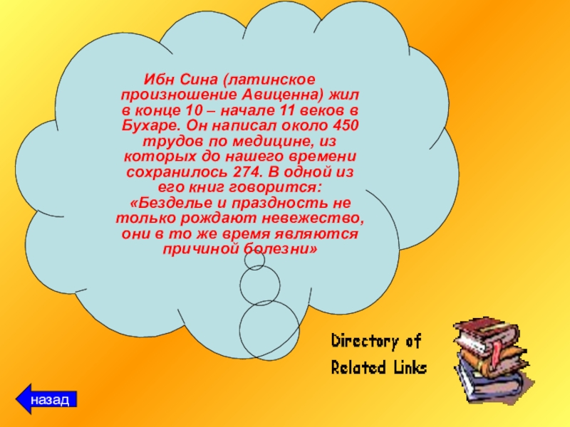 11 веков в Бухаре. Он написал около 450 трудов по медицине, из которых до нашего времени сохранилось 274. В одной из его книг говорится: «Безделье и праздность не только рождают невежество, они в то же время являются причиной болезни»