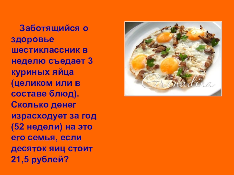 3 куриных яйца (целиком или в составе блюд). Сколько денег израсходует за год (52 недели) на это его семья, если десяток яиц стоит 21,5 рублей?