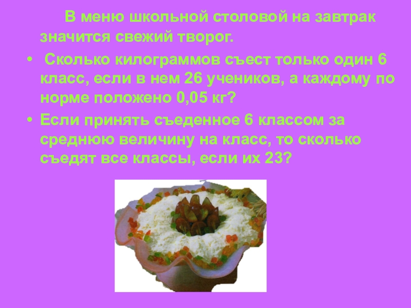 Сколько килограммов съест только один 6 класс, если в нем 26 учеников, а каждому по норме положено 0,05 кг?