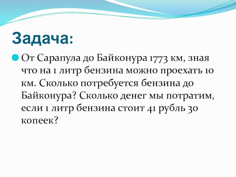 Задача:От Сарапула до Байконура 1773 км, зная что на 1 литр бензина можно проехать 10 км. Сколько