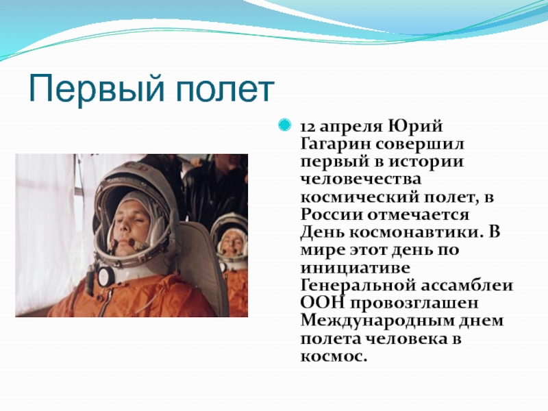 Первый полет 12 апреля Юрий Гагарин совершил первый в истории человечества космический полет, в России отмечается День