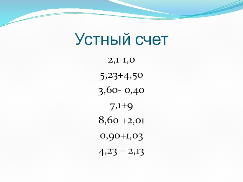 Устный счет 2,1-1,05,23+4,503,60- 0,407,1+98,60 +2,010,90+1,034,23 – 2,13