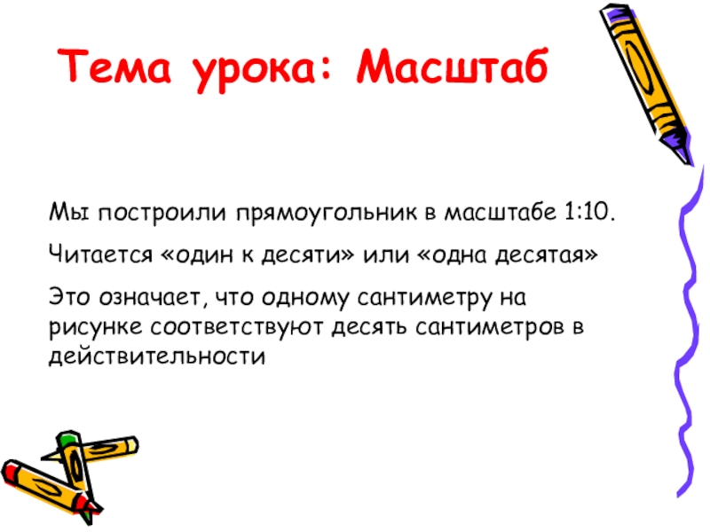 Тема урока: Масштаб Мы построили прямоугольник в масштабе 1:10.Читается «один к десяти» или «одна десятая»Это означает, что