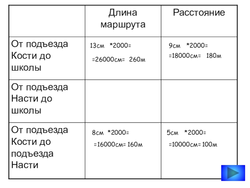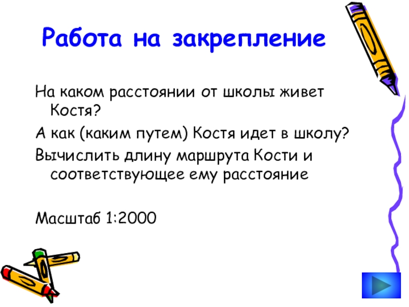 Работа на закреплениеНа каком расстоянии от школы живет Костя?А как (каким путем) Костя идет в школу?Вычислить длину