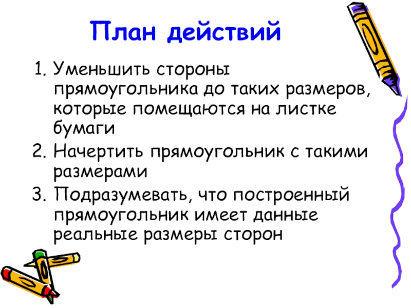 План действийУменьшить стороны прямоугольника до таких размеров, которые помещаются на листке бумагиНачертить прямоугольник с такими размерамиПодразумевать, что