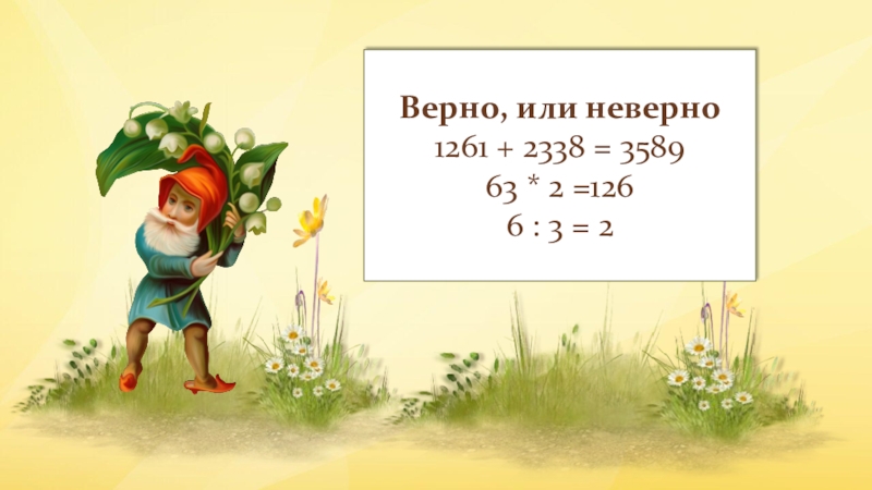 Макет заголовка и объектов с диаграммойВерно, или неверно1261 + 2338 = 358963 * 2 =1266 : 3