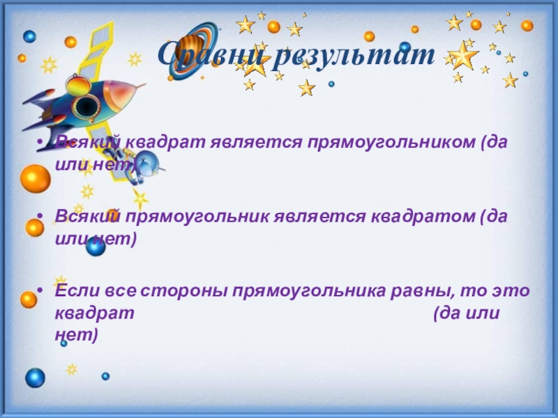 Сравни результатВсякий квадрат является прямоугольником (да или нет)Всякий прямоугольник является квадратом (да или нет)Если все