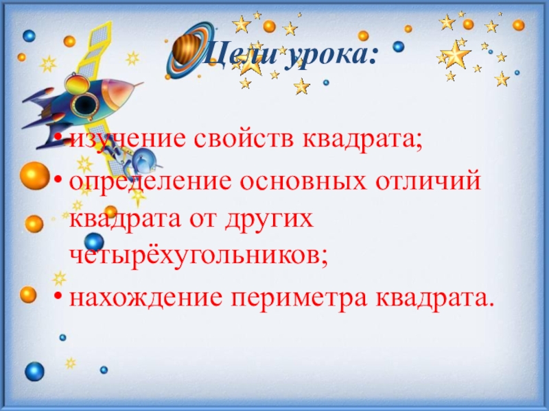 Цели урока:изучение свойств квадрата;определение основных отличий квадрата от других четырёхугольников;нахождение периметра квадрата.