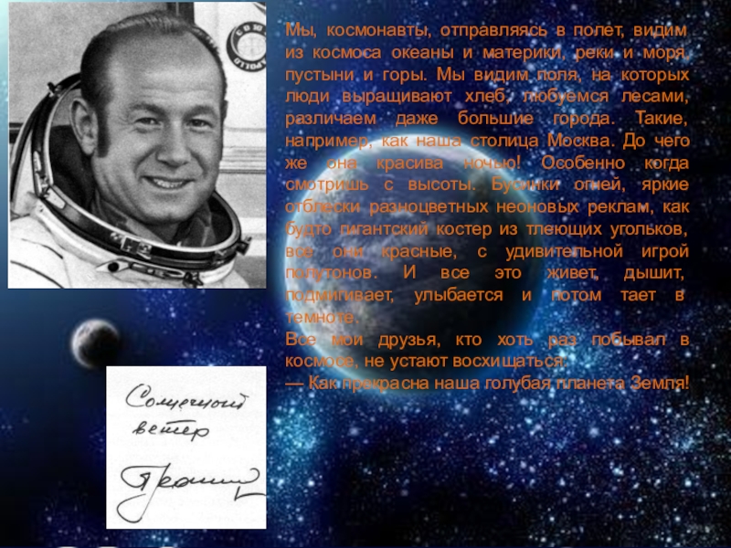 Слайд 26Мы, космонавты, отправляясь в полет, видим из космоса океаны и материки,