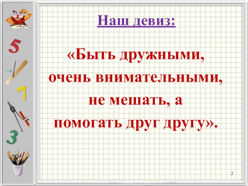 Наш девиз:«Быть дружными,  очень внимательными,  не мешать, а помогать друг другу».