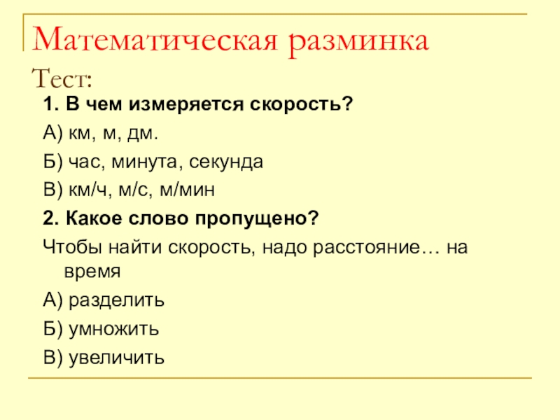 Математическая разминка Тест:1. В чем измеряется скорость?А) км, м, дм.Б) час, минута, секундаВ) км/ч, м/c, м/мин2. Какое