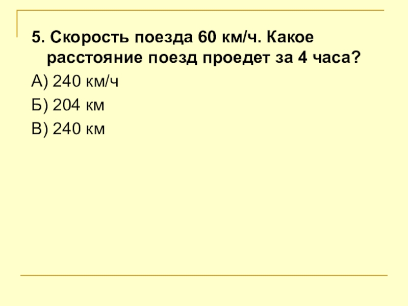 5. Скорость поезда 60 км/ч. Какое расстояние поезд проедет за 4 часа?А) 240 км/чБ) 204 кмВ) 240