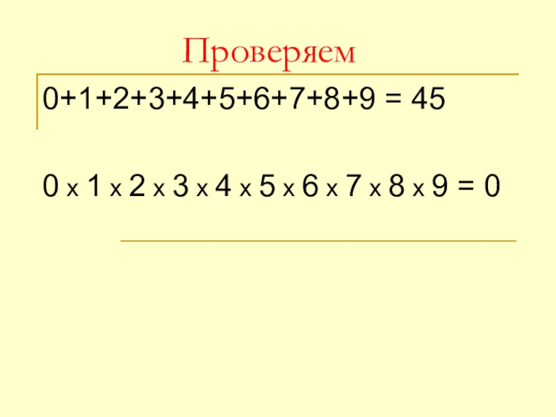 Проверяем0+1+2+3+4+5+6+7+8+9 = 450 х 1 х 2 х 3 х 4 х 5 х 6 х 7