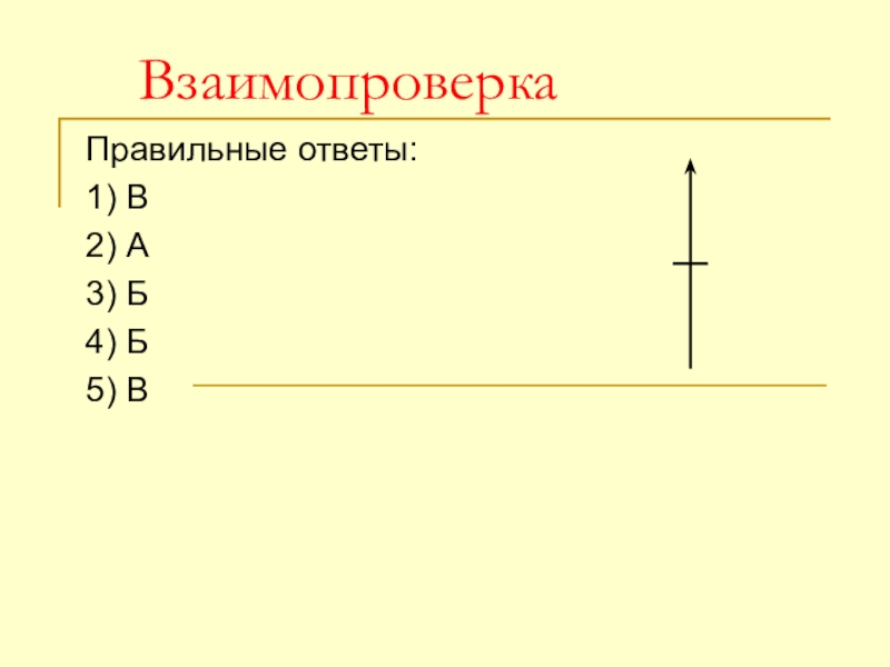 ВзаимопроверкаПравильные ответы:1) В 2) А 3) Б 4) Б 5) В
