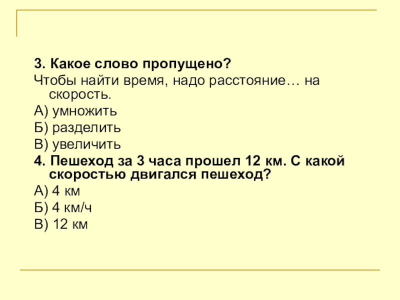 3. Какое слово пропущено?Чтобы найти время, надо расстояние… на скорость.А) умножитьБ) разделитьВ) увеличить4. Пешеход за 3 часа