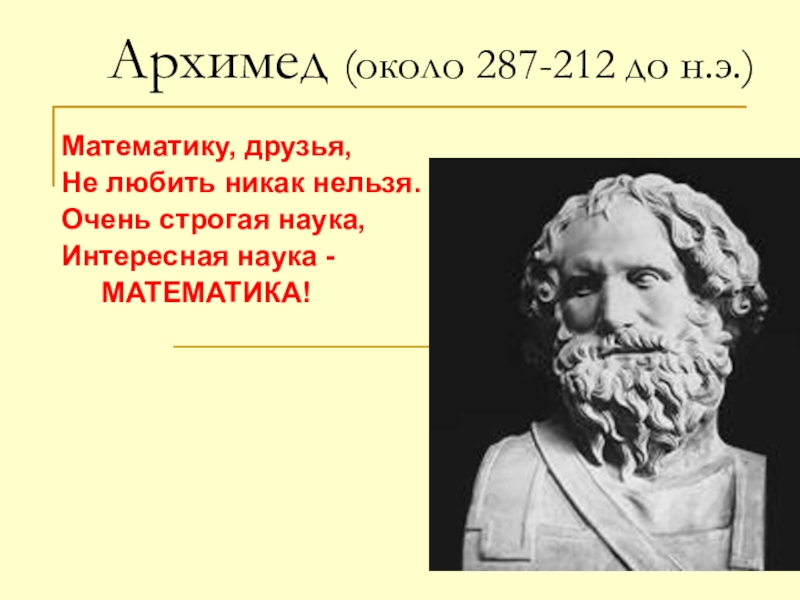 Архимед (около 287-212 до н.э.)Математику, друзья,Не любить никак нельзя.Очень строгая наука,Интересная наука -   МАТЕМАТИКА!