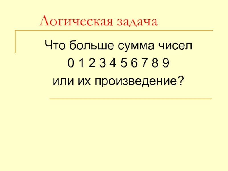 Логическая задачаЧто больше сумма чисел 0 1 2 3 4 5 6 7 8 9 или их
