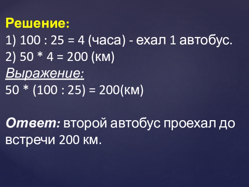 автобуса. Один автобус до встречи проехал 100 км со скоростью 25 км/час.