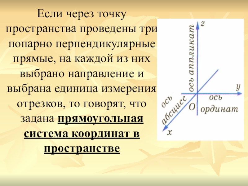 из них выбрано направление и выбрана единица измерения отрезков, то говорят, что задана прямоугольная система координат в пространстве