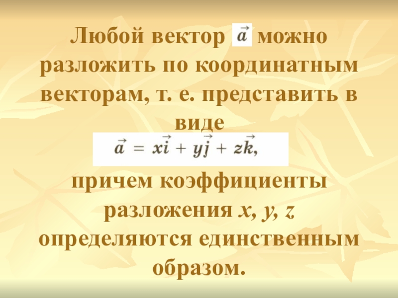 Слайд 10Любой вектор можно разложить по координатным векторам, т. е.