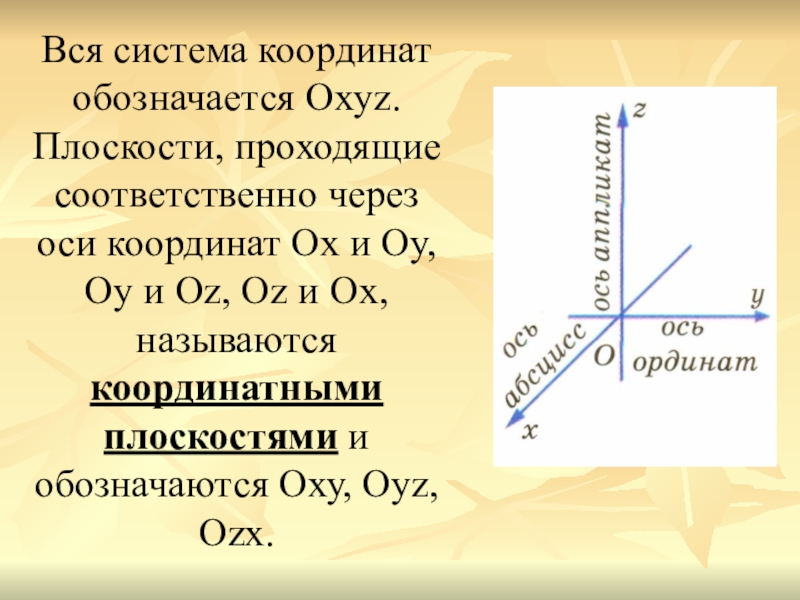 Слайд 5Вся система координат обозначается Охуz. Плоскости, проходящие соответственно через оси координат